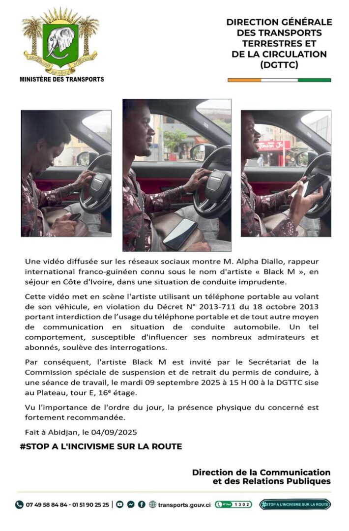 L’artiste franco-guinéen Black M est dans le collimateur de la Direction Générale des Transports Terrestres et de la Circulation (DGTTC). Tout est parti d’une vidéo publiée sur sa page Facebook le 3 septembre 2025, où il apparaît en train d’utiliser son téléphone au volant.
