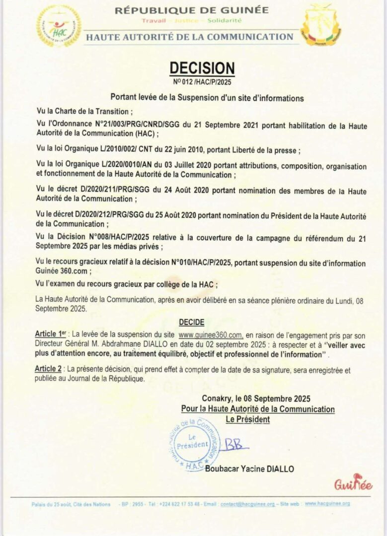 Cette décision intervient après l’engagement pris par M. Abdrahmane Diallo, Directeur Général de Guiné360, le 2 septembre 2025, de garantir un traitement de l’information à la fois équilibré, objectif et professionnel.