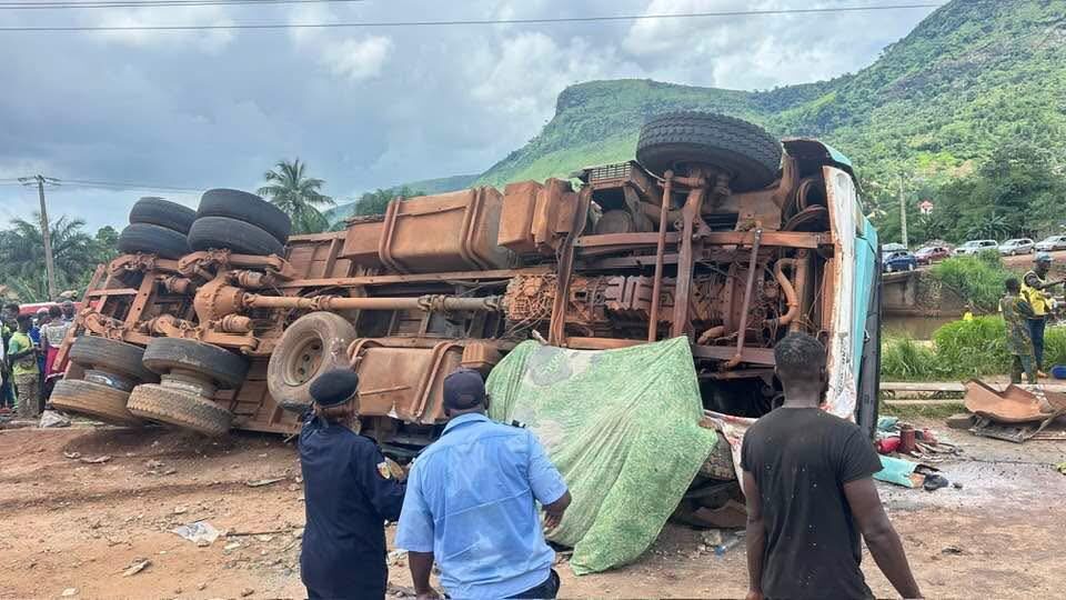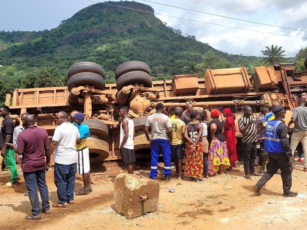 Un camion-remorque chargé de boissons alcoolisées s’est renversé ce vendredi à la descente de Friguiadi, non loin du pont de Kitema. Selon les témoins, le conducteur aurait perdu le contrôle de l’engin, qui a terminé sa course les 12 roues en l’air.