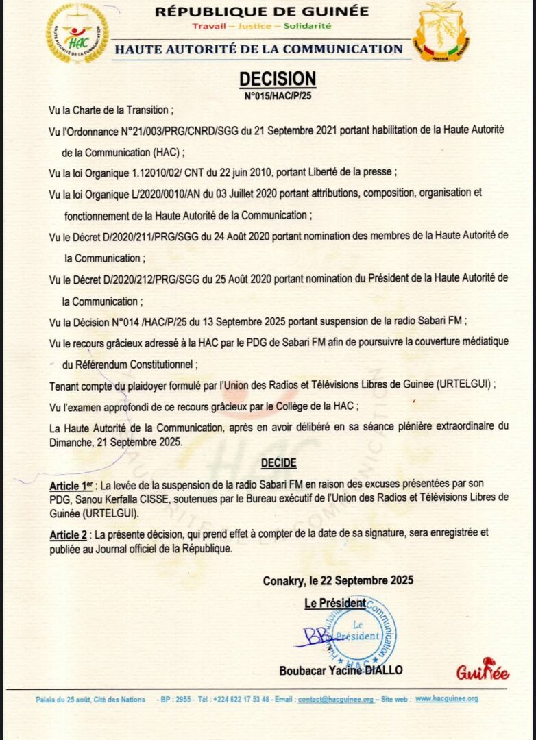 Selon la Haute Autorité de la Communication, cette levée fait suite aux excuses présentées par le PDG de Sabari FM, Sanou Kerfalla Cissé, et soutenues par le bureau exécutif de l’Union des radios et télévisions libres de Guinée.