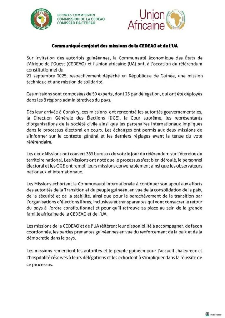 Déployées en Guinée à l’occasion du référendum constitutionnel du 21 septembre, les missions de la CEDEAO et de l’Union africaine, conduites respectivement par l’ambassadeur Abdel-Fatau Musah, Commissaire aux Affaires politiques, Paix et Sécurité de la CEDEAO, et par l’ambassadeur Bankole Adeoye, son homologue de l’Union africaine, ont jugé que le scrutin s’est déroulé dans de bonnes conditions.