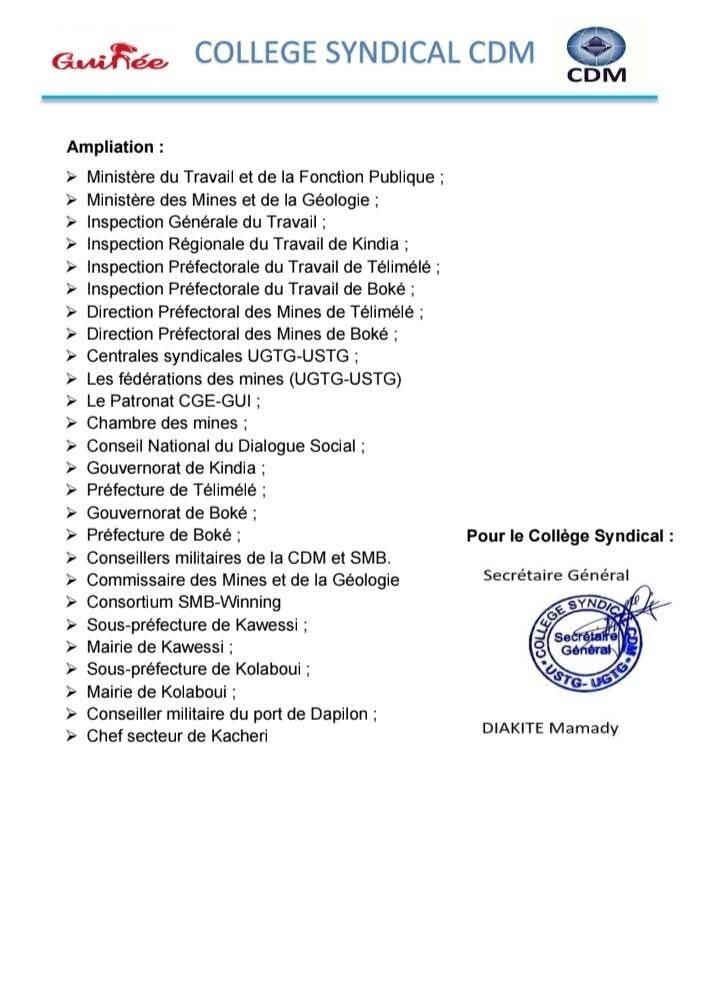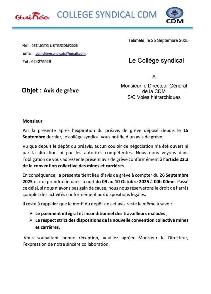 Le collège syndical de la société minière CDM-Chine est passé à l’action. Après plusieurs mises en garde ignorées par la direction, les travailleurs ont déclenché une grève ce vendredi 26 septembre 2025. En ligne de mire : le non-respect de la convention collective des mines et carrières en République de Guinée.