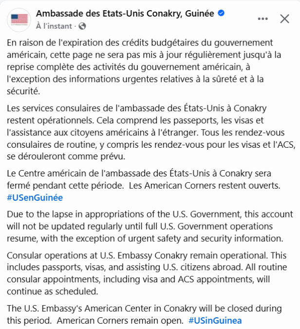 Cette impasse politique, qui a éclaté après l’échec des négociations avant la date butoir du 30 septembre à minuit, n’épargne pas l’international. En Guinée, l’ambassade des États-Unis a annoncé via sa page Facebook que cette dernière (Page Facebook) ne sera pas « mise à jour régulièrement jusqu’à la reprise complète des activités du gouvernement américain », sauf pour les informations urgentes relatives à la sûreté et à la sécurité.