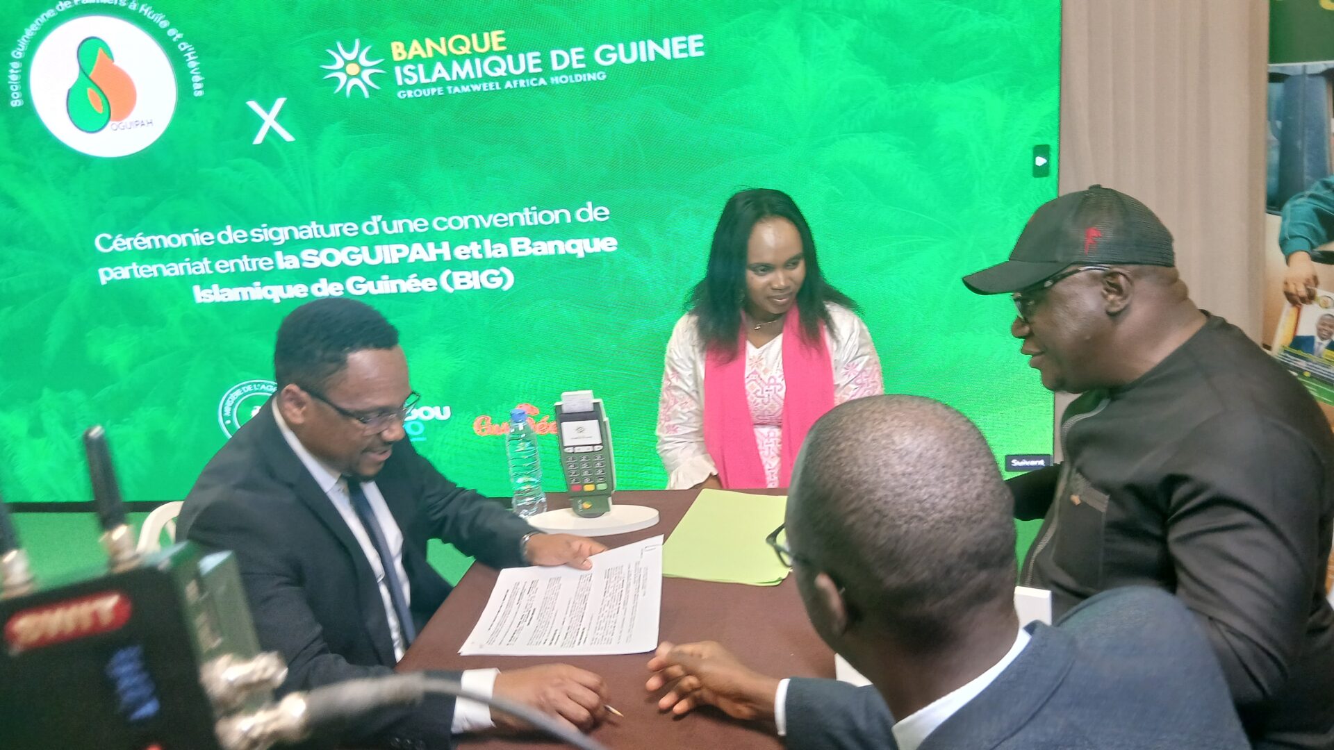 Ce mercredi 5 novembre 2025, la Société Guinéenne de Palmiers à Huile et d’Hévéa (SOGUIPAH S.A.) et la Banque Islamique de Guinée (BIG) ont signé une convention de partenariat stratégique. La cérémonie tenue dans un réceptif hôtelier de Conakry été marquée par la présence de la ministre de l’agriculture, mais aussi de nombreuses personnalités du monde administratif, financier et agricole.