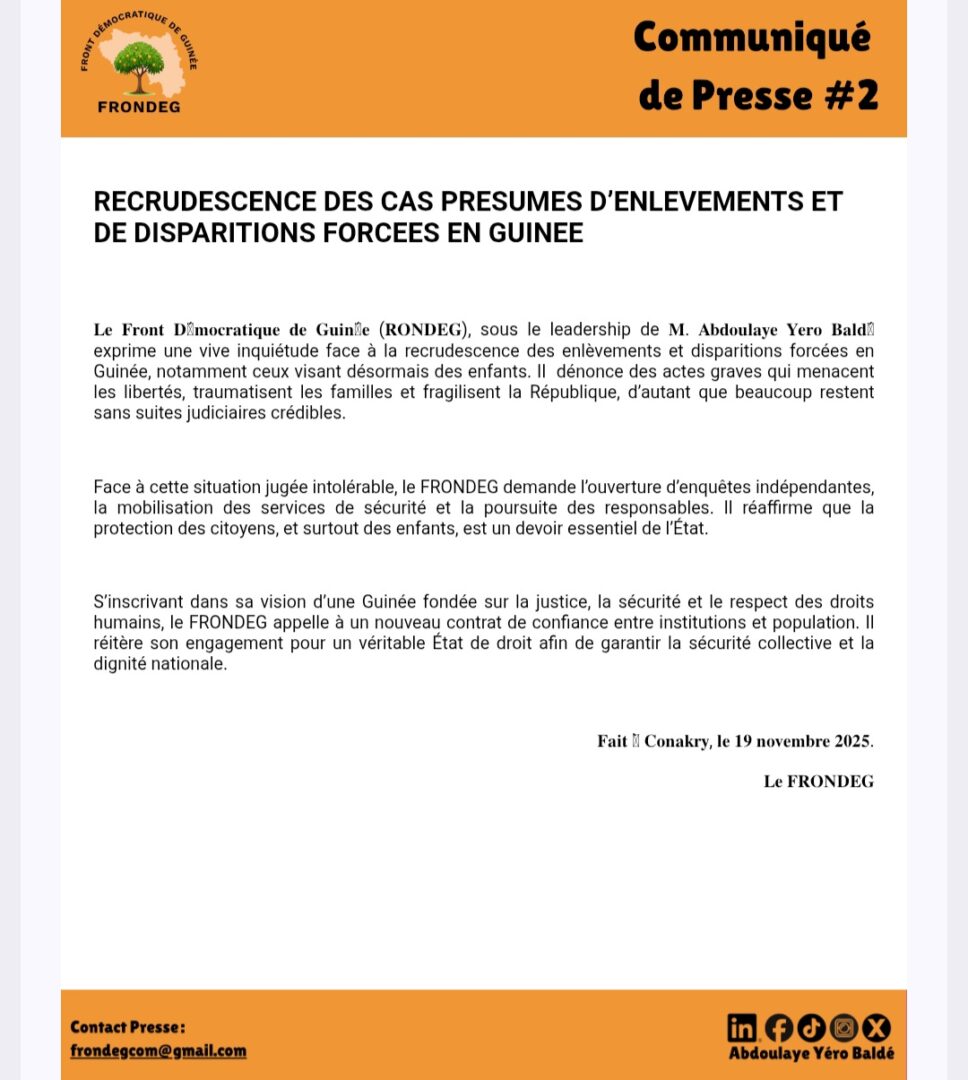 Face à une inquiétante hausse des cas d’enlèvements et de disparitions forcées, le Front Démocratique de Guinée (FRONDEG), dirigé par Abdoulaye Yero Baldé, exprime une vive préoccupation, en particulier pour les enfants désormais ciblés. Le dernier en date est relatif à l’enlèvement présumé des enfants de l’artiste Elie Kamano. Dans un communiqué, le parti dénonce « des actes graves qui menacent les libertés, traumatisent les familles et fragilisent la République », soulignant que « beaucoup de ces affaires restent sans suites judiciaires crédibles ».