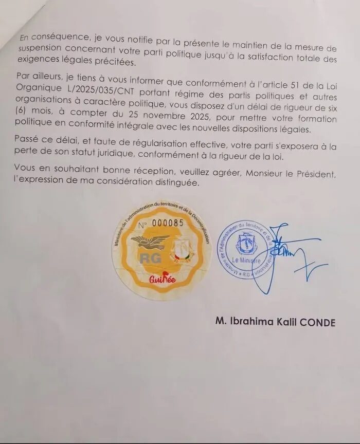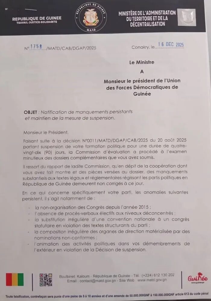Mais cette lecture est vigoureusement contestée par le MATD. Dans un courrier notifié au parti le 16 décembre 2025, le ministère maintient la suspension, évoquant la persistance de « manquements substantiels aux textes légaux et réglementaires régissant les partis politiques en République de Guinée ». Malgré la coopération affichée par l’UFDG et les pièces versées à son dossier, le département estime que plusieurs irrégularités demeurent non corrigées.