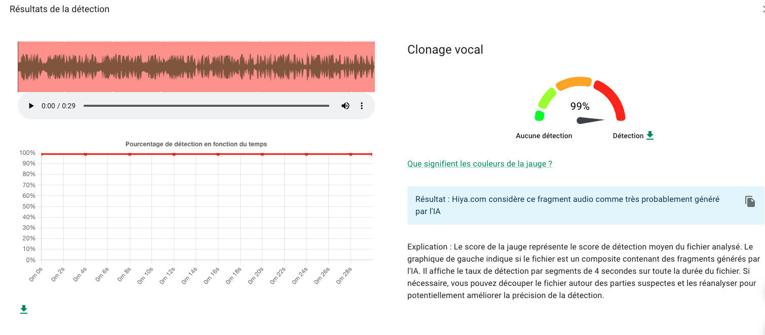 Nous avons utilisé l’outil InVid pour authentifier le prétendu reportage (voici comment procéder). Dès l’importation de la prétendue vidéo de 30 secondes, hiya.com a indiqué que l’audio ou le son est un clonage vocal. Il émane à 99% d’une intelligence artificielle.