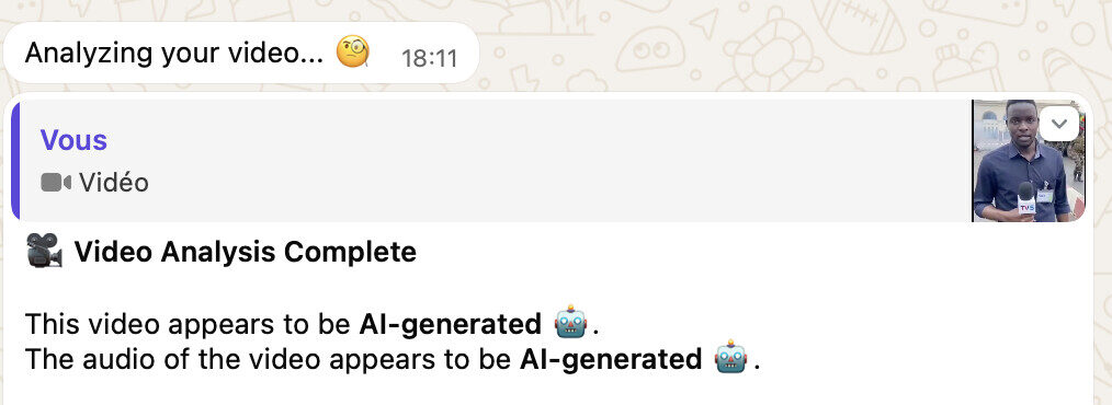 Les mêmes résultats ont été obtenus par l’outil de détection propulsé conjointement par UncovAI et   TrustMyContent. Ce dernier intégré à la messagerie WhatsApp permet d’authentifier un contenu depuis votre canapé.