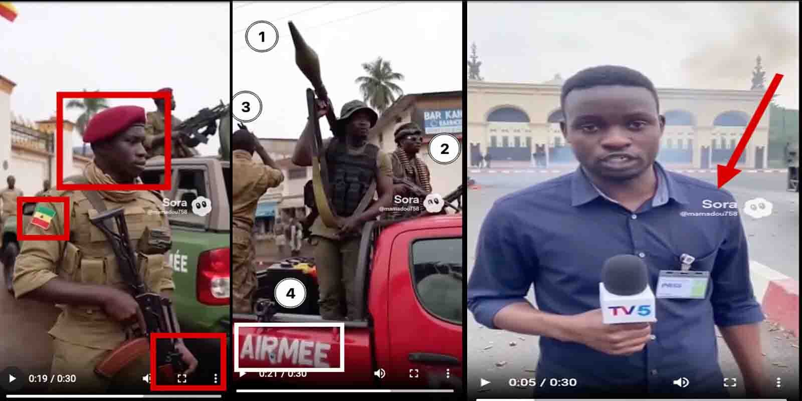 Sur cette autre capture, nous observons plusieurs déformations visuelles. Quant à l’environnement, il ne ressemble pas à Conakry. Les insignes des prétendus militaires dont les regards sont figés dans le vide ne ressemblent pas à ceux de l’armée guinéenne.  Sur le véhicule rouge au milieu en couleur, vers le bas, nous remarquons l’erreur orthographique “airmée” au lieu de “armée’’.
