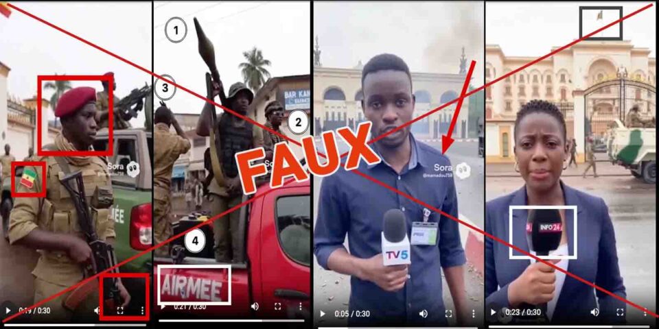 Ce prétendu reportage a été généré par Sora, une intelligence artificielle développée par OpenAI, la maison mère de ChatGPT. Dans la première partie de ce deepfake d’environ 30 secondes présenté comme un élément de reportage, deux journalistes (un homme et une femme) annoncent un prétendu conflit entre des hauts responsables militaires de la transition en Guinée à savoir : le Général Amara Camara porte-parole et secretaire general de la la Presidence, Général Balla Samoura, Haut Commandant de la Gendarmerie nationale et le General à la retraite et ministre de la Defense nationale, Aboubacar Sidiki Camara alias « Idi Amin ».