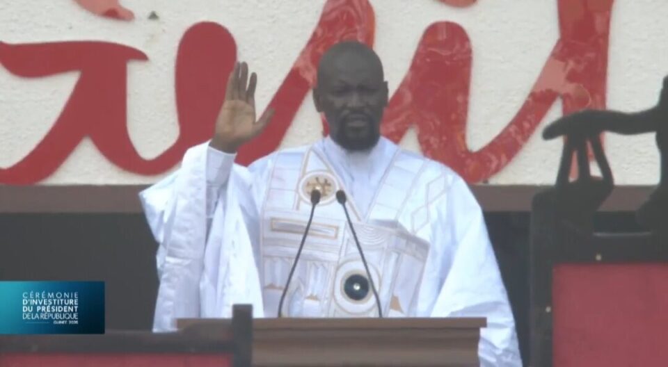 « Moi Mamadi Doumbouya, Président de la République élu, je jure devant Dieu et devant le Peuple de Guinée, sur món honneur: -de respecter et de faire respecter scrupuleusement la Constitution, les lois, les règlements et les décisions de justice; -d’exercer loyalement et dignement les fonctions qui me sont conférées dans l’intérêt supérieur de la Nation; -de ne jamais recourir aux pouvoirs qui me sont dévolus à des fins personnelles; -de préserver, en tout lieu et en toute circonstance, la paix, la cohésion sociale et l’unité nationale; – de défendre les Institutions de la République, l’intégrité du territoire et l’indépendance nationale. En cas de parjure, que je subisse la rigueur de la loi ».