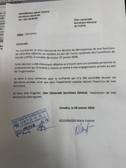 Trésorière adjointe et membre de l’Union syndicale des travailleurs de Guinée (USTG), Marie-Yvonne Koumbassa a annoncé sa démission. L’information a été rendue publique ce mercredi 28 janvier 2026 à travers un communiqué.