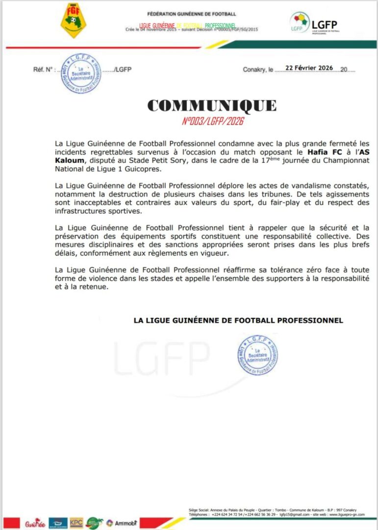 Dans un communiqué officiel, l’instance en charge du football professionnel guinéen condamne fermement les débordements enregistrés, notamment la casse de plusieurs chaises dans les tribunes. Elle déplore des comportements qu’elle juge contraires à l’éthique sportive et aux principes de respect qui doivent prévaloir dans les stades.