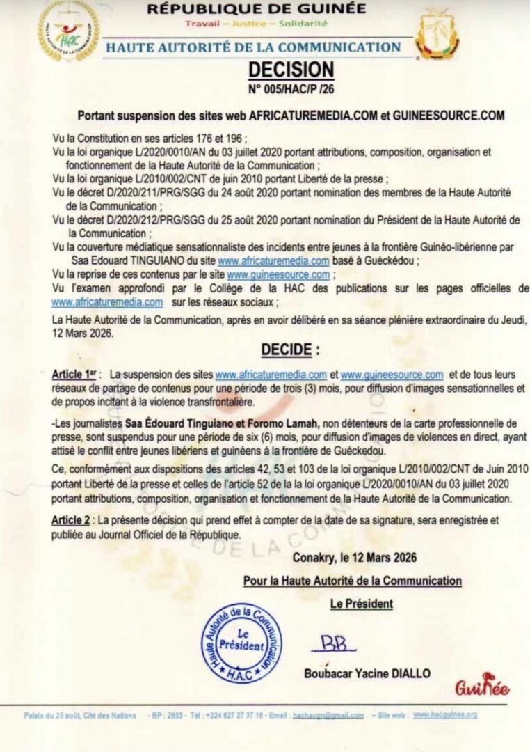 La Haute Autorité de la Communication (HAC) a annoncé, ce jeudi 12 mars 2026, la suspension de deux sites d’information pour trois mois : www.africaturemedia.com et www.guineesource.com. Ces plateformes sont accusées de diffuser des contenus sensibles susceptibles d’attiser les tensions à la frontière guinéo-libérienne.
