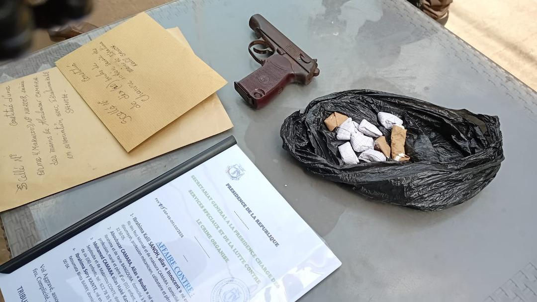 Après leur arrestation, une arme à feu a été saisie sur Aboubacar Camara. Un agent des Services spéciaux, présent à proximité, a ensuite conduit les suspects à la gendarmerie de la T10. La collaboration entre les services a permis l’interpellation de deux autres complices : Mohamed Camara et Ibrahima Sory Kanté.