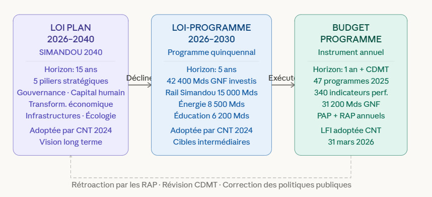 La LFI adoptée le 31 mars 2026 traduit en langage budgétaire les ambitions de la Loi Plan 2026-2040 (Simandou 2040) et de la Loi-Programme 2026-2030, toutes deux adoptées par le CNT en 2024, formant ainsi le triptyque stratégique inédit de la modernisation financière guinéenne.