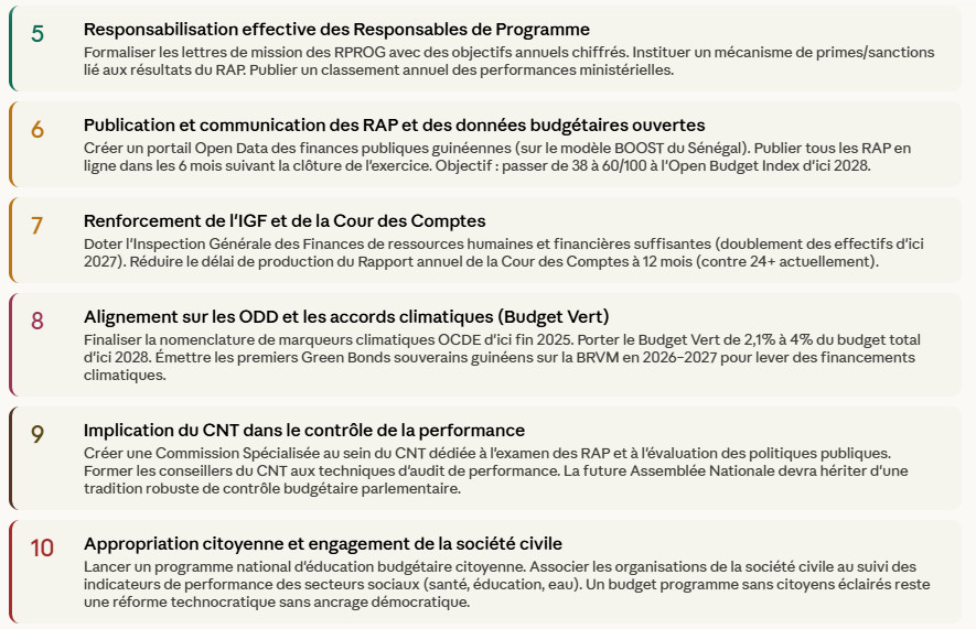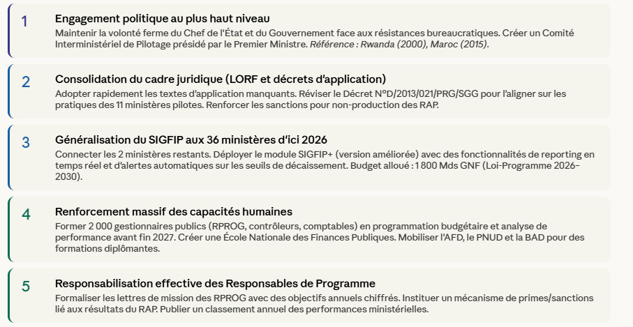 Fondées sur l’analyse comparative des réformes africaines (Maroc, Sénégal, Rwanda, Afrique du Sud) et des évaluations FMI/Banque Mondiale de la réforme guinéenne.