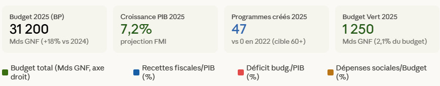 La trajectoire est rigoureusement ascendante. Le budget total passe de 19 240 milliards GNF en 2022 à 31 200 milliards en 2025, soit une progression de 62,2% en trois ans. La part des dépenses sociales dans le budget augmente de 21,3% à 28%, traduisant la priorité accordée au capital humain. Le déficit budgétaire, quant à lui, se réduit progressivement de -3,8% à -2,5% du PIB, démontrant que l’efficacité de la dépense permet simultanément d’améliorer les services publics et de consolider les finances publiques.