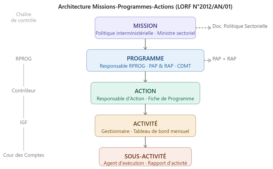 La réforme ne surgit pas du néant. Son fondement juridique est la Loi Organique N° 2012/AN/01 du 22 décembre 2012 relative aux Lois de Finances (LORF), complétée par le Décret N° D/2012/279/PRG/SGG du 31 décembre 2012 portant Règlement Général sur la Comptabilité Publique. Ces textes fondateurs, adoptés il y a plus d’une décennie, ont institué le cadre normatif de la gestion axée sur les résultats. Mais c’est seulement pour l’exercice 2025 que la mise en œuvre effective du Budget Programme a été officiellement lancée, marquant la pleine application des dispositions de la LORF après une phase de transition de treize ans, phase portée par le Plan d’Action de Réforme des Finances Publiques (PARFP) 2022–2026 et le Comité National de Pilotage de la Réforme des Finances Publiques.