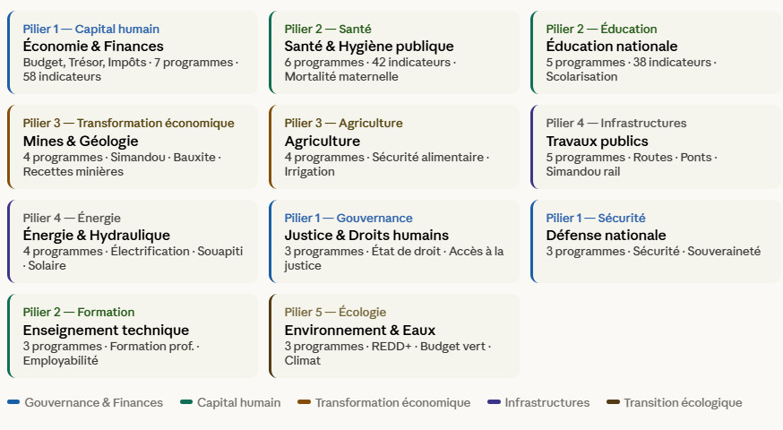 Ces onze ministères représentent collectivement environ 73% du budget total de l’État guinéen pour 2025, estimé à 31 200 milliards de francs guinéens (GNF). Ils sont responsables de 47 des 60 programmes budgétaires créés pour l’exercice, et portent 340 des 500+ indicateurs de performance prévus à l’horizon 2030. Le ministère de l’Économie et des Finances, chef de file de la réforme, structure à lui seul 7 programmes autour desquels gravitent les fonctions régaliennes de la gestion budgétaire : programmation des ressources, régulation de l’exécution, gestion de la trésorerie et contrôle de la performance.