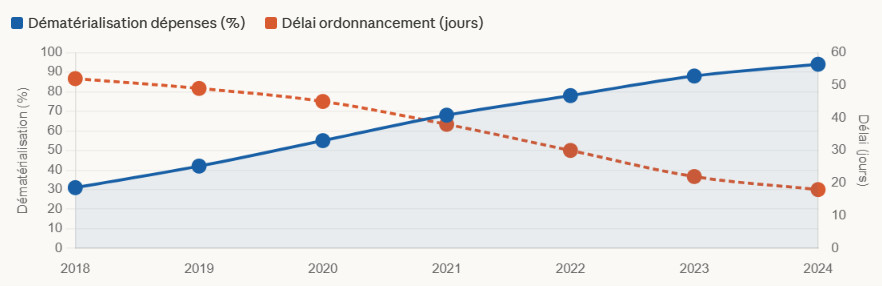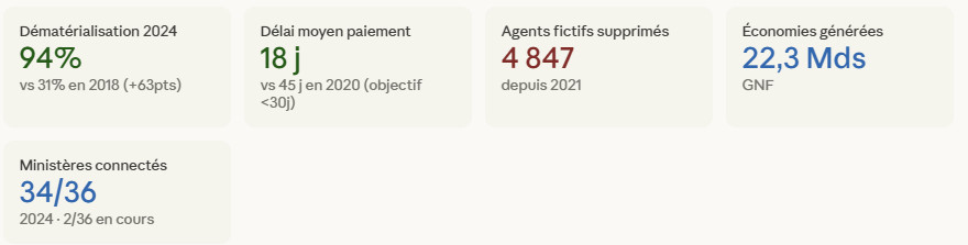 Les résultats quantifiés du déploiement du SIGFIP sont éloquents. En 2024, selon le Rapport DNB 2023–2024, le taux de dématérialisation des dépenses publiques atteignait 94% contre 31% seulement en 2018, soit une progression de 63 points en six ans. Le délai moyen d’ordonnancement des dépenses est tombé de 45 jours en 2020 à 18 jours en 2024, améliorant considérablement la liquidité des fournisseurs de l’État et réduisant le risque d’arriérés de paiement. L’opération de purge du fichier solde, rendue possible par le module de gestion de la masse salariale, a permis de détecter et supprimer 4 847 agents fictifs depuis 2021, générant des économies budgétaires de 22,3 milliards GNF, de quoi financer intégralement plusieurs programmes d’investissement dans l’éducation primaire. En 2024, 34 des 36 ministères sont connectés au SIGFIP, les deux restants étant en cours d’intégration.