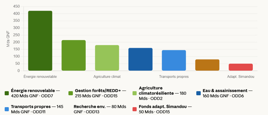 Répartition du Budget Vert 2025. Total : 1 250 Mds GNF (2,1% du budget) | Objectif 2028 : 4%