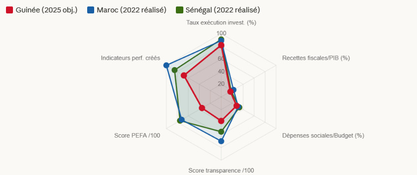 Le radar de benchmarking révèle sans ambiguïté le chemin parcouru et celui qui reste à parcourir. La Guinée, au stade initial du déploiement de son Budget Programme, présente des performances encore inférieures à celles du Maroc et du Sénégal sur la plupart des dimensions. Mais la trajectoire de ses indicateurs sur les trois dernières années montre une convergence dynamique vers les standards de performance de ces deux pays. Avec un score de transparence budgétaire encore modeste (environ 38/100 contre 70 pour le Maroc), la Guinée doit investir massivement dans la publication et la communication de ses RAP, la mise en ligne des données budgétaires et le renforcement du contrôle parlementaire.