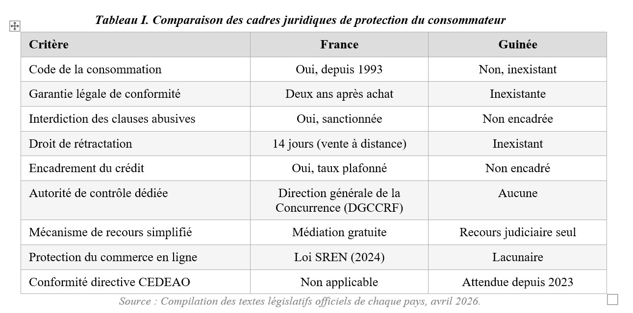 Le tableau ci-après (voir Tableau I) présente une synthèse comparative des principaux indicateurs de protection du consommateur entre la France, dont le modèle est examiné en détail, et la Guinée, dont les lacunes constituent l’objet central du présent article.
